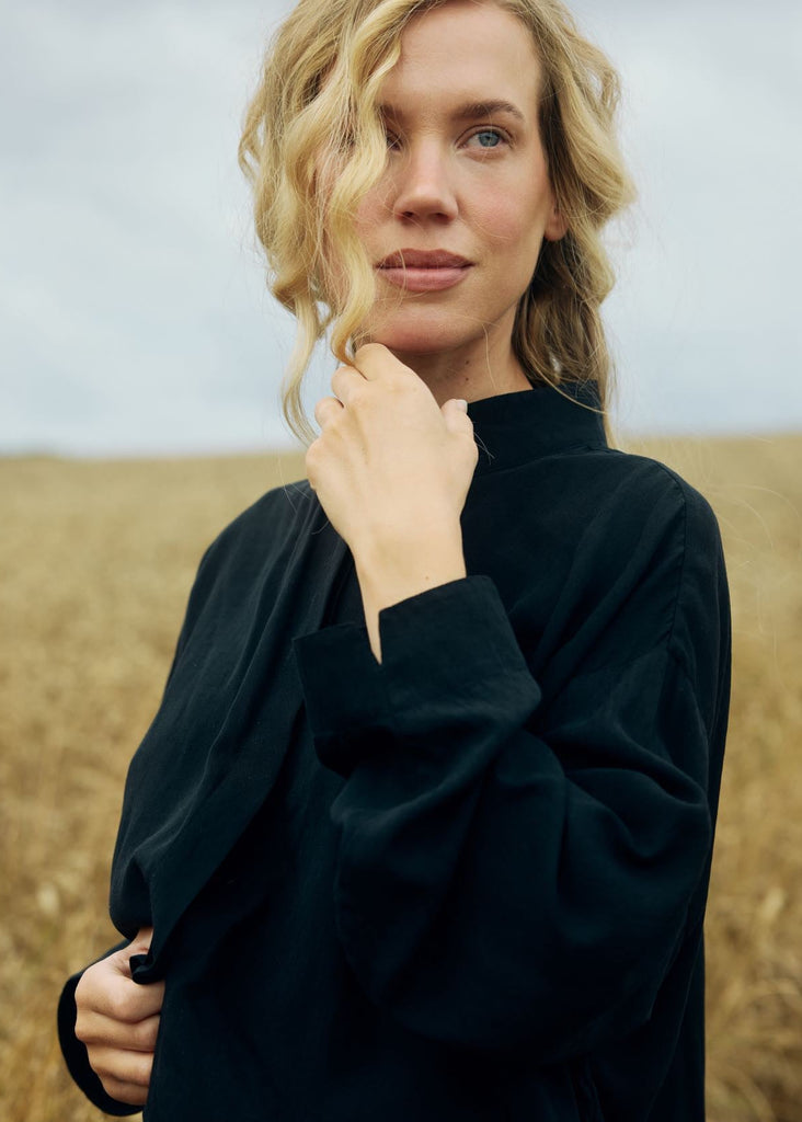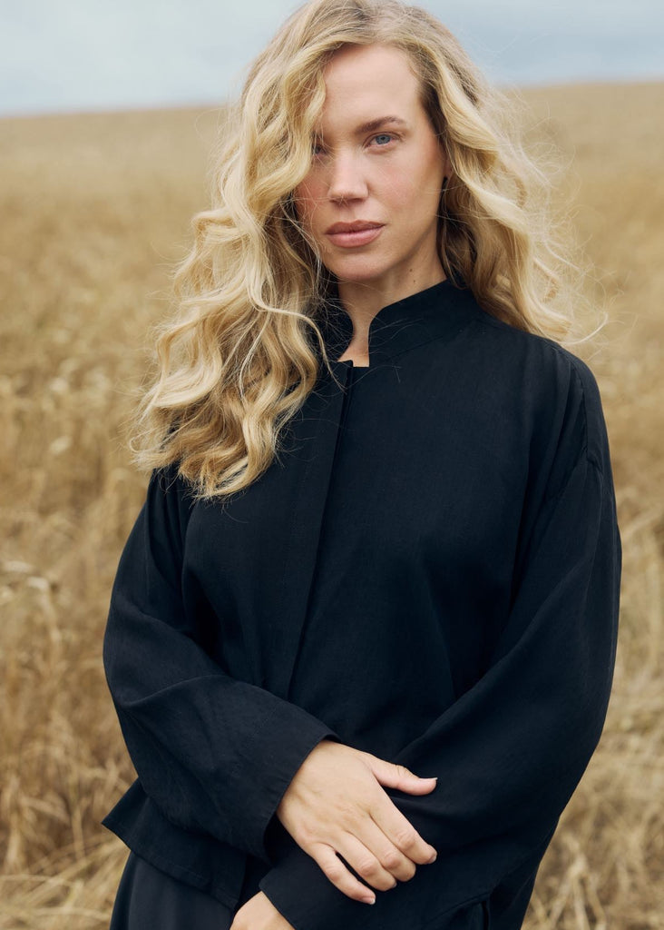Our Jo shirt has a timeless, classic look with hidden buttons and a Chinese collar. The shirt is slightly oversize and shorter in length. This light, airy and silky feel shirt is made in Tencel ™️ Lyocell fabric with small woven diamond shapes to add a subtle textured touch of elegance. This shirt is a must have for every season and any occasion.
